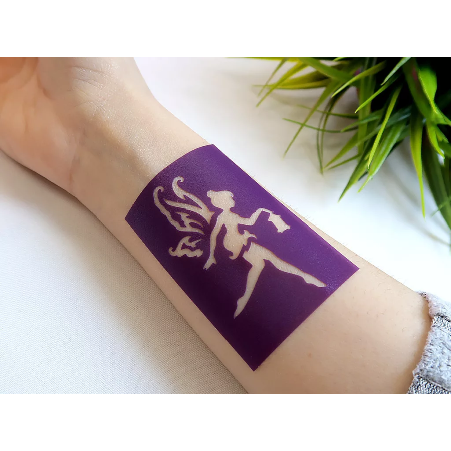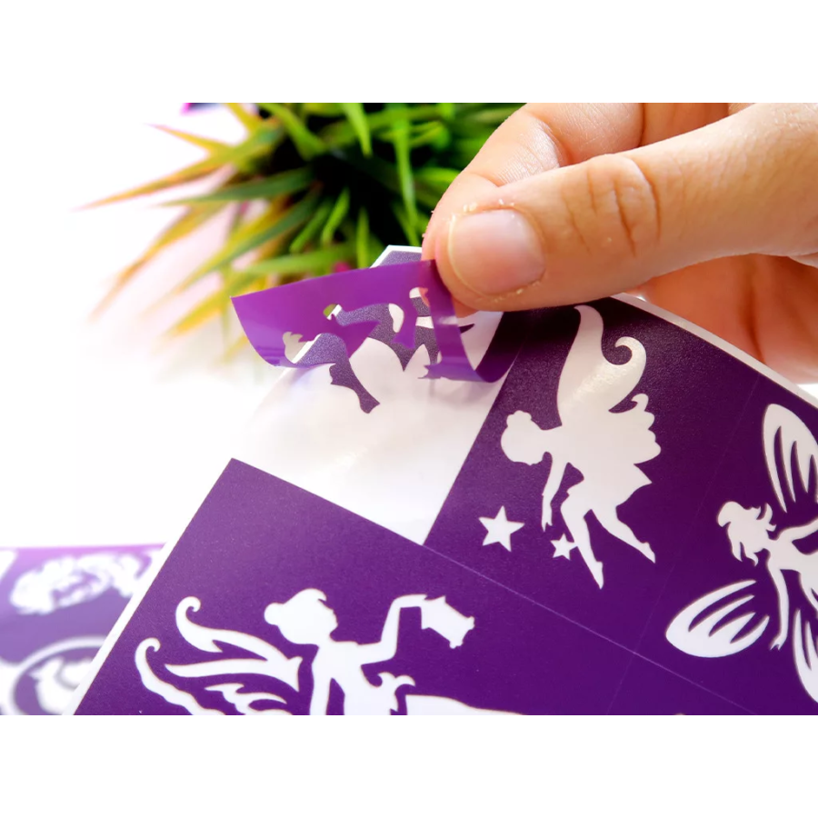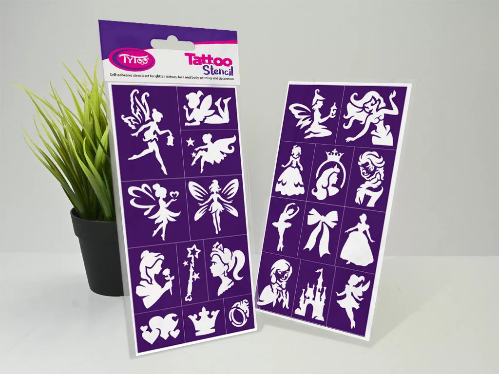 A csomagban legalább 20 különböző minta található, két nagy méretű íven (10cm x 20cm) elrendezve, így garantált a hosszú távú kreatív szórakozás. A sablonok két rétegűek, nem kell kivágni őket: egyszerűen csak le kell húzni az ívről, rásimítani a bőrre, és már indulhat is a festés vagy csillámporozás!