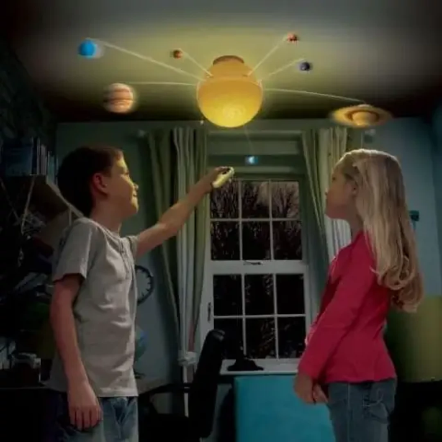 Használd a távirányítót a nap megvilágításához és a bolygók nap körüli keringtetéséhez. Amint a nap világítani kezd, fényét ontja a körülötte mozgó színes bolygókra is. Nappal a modell egy gondolkodásra késztető és ámulatba ejtő dísze a szobádnak, éjjel pedig a világító nap megnyugtató éjszakai fényforrásként szolgál, míg álomba nem szenderülsz, amiről az automatikus kikapcsoló funkció gondoskodik.