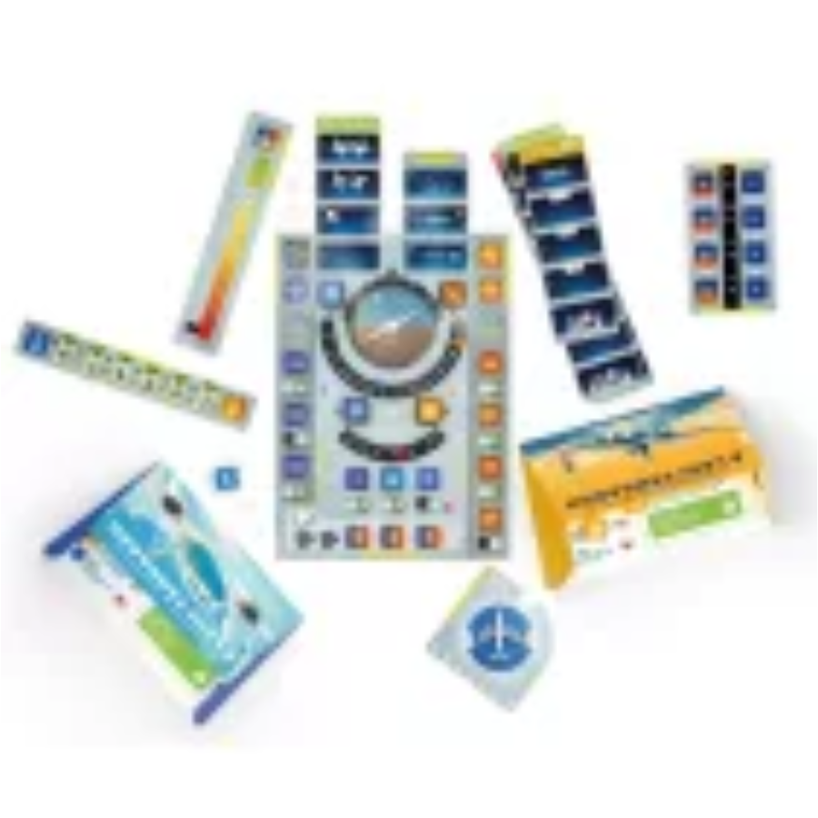 | 1 leszállási eljárás füzet 1 háromrétegű vezérlőpult 1 fordulásjelző-korong 4 kék dobókocka 4 narancssárga dobókocka 2 paraván/játékossegédlet 1 magasságsáv 1 megközelítéssáv (Montreal-YUL) 12 repülőjelölő 2 aerodinamika jelölő (kék és narancssárga) 1 fékjelölő (piros) 3 kávéjelölő 2 újradobás jelölő 10 kapcsoló | |