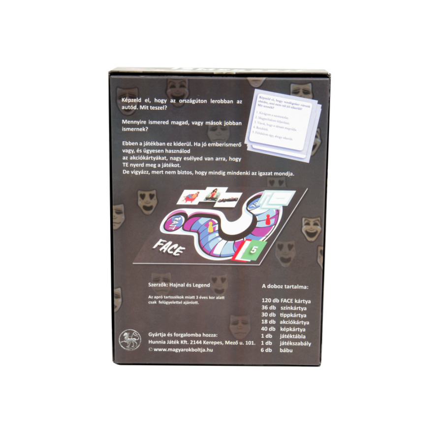 Képzeld el, hogy az országúton lerobban az autód. Mit teszel? Mennyire ismered magad? Vagy mások jobban ismernek? Ebben a játékban ez kiderül. Ha jó ember ismerő vagy és ügyesen használod az akció kártyákat, nagy esélyed van arra, hogy te nyerd meg a játékot. De vigyázz, mert nem biztos, hogy mindenki az igazat mondja. A doboz tartalma: 120 db. face kártya 36db. szín kártya 30 db. tipp kártya 18 db. akció kártya 40 db. kép kártya 1 db. játék tábla 1 db. játékszabály 6 db. bábu