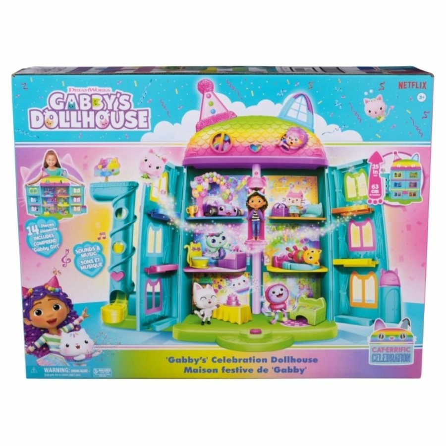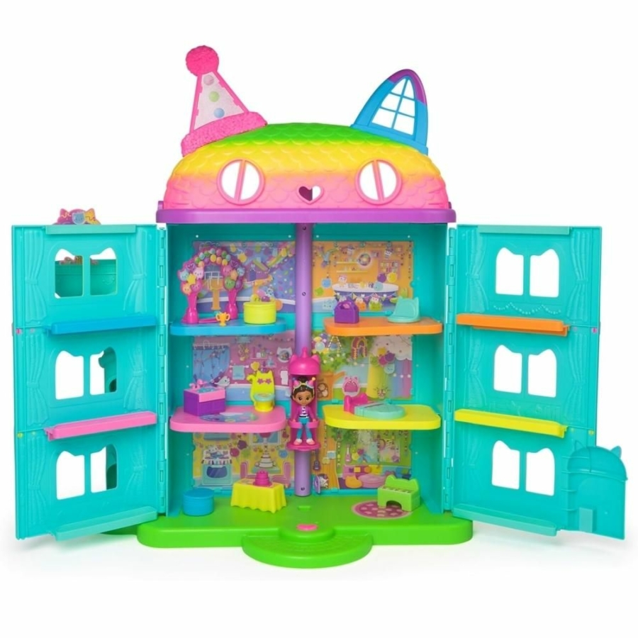 Ez a 60 centiméter magas, szivárványos mestermű tele van meglepetésekkel amik csak a gyerekekre várnak, hogy felfedezzék őket! A gomb megnyomásával kinyílik az ajtó és indulhat a móka: a babaház minden fontos bútort és szobát tartalmaz, amire csak szükség lehet, egy jó kis ünnepléshez. Van itt asztal, lift, cicás WC, zongora és DJ pult, konyha, buliszoba és még sok minden más. A gyerekek együtt ünnepelhetnek Gabival, Pici Dobozzal, Süti cicával és az összes többi cicabarátjukkal.