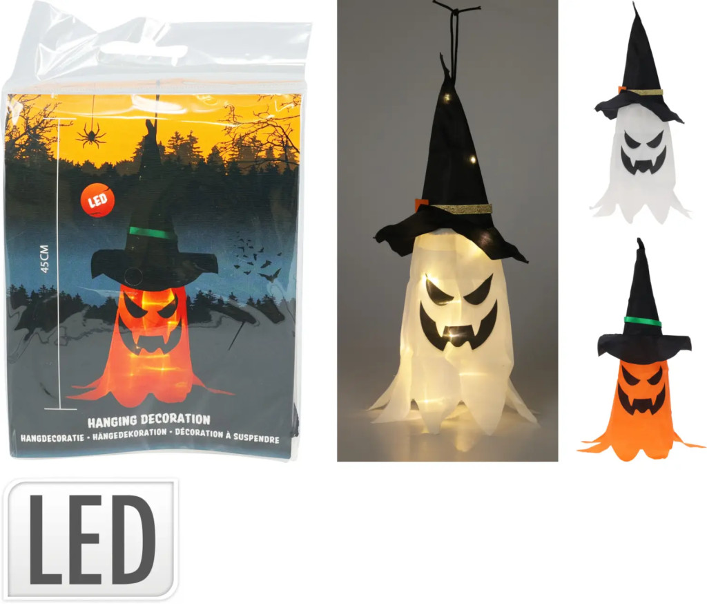 Egy igazi hátborzongató hangulatú dekorációval könnyedén feldobhatod a halloweeni estét, és pontosan erre szolgál ez a LED világítással ellátott függő dísz. A különleges dekoráció 45 cm magas, és szellemesen ötvözi a boszorkánykalapot egy félelmetes arcot formázó lámpással. Az élénk fények életre keltik a dekorációt, így sötétben igazán kísérteties hangulatot áraszt, amely garantáltan lenyűgözi a vendégeket és elvarázsolja a gyerekeket is.