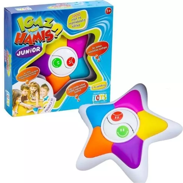 1000 elképesztő állítás. Vajon melyik igaz és melyik hamis? Izgalmas ki mit tud az egész családnak. Visszatért a nagysikerű Igaz vagy Hamis? társasjáték egy újabb kiadással - kifejezetten gyerekeknek! Te mindent elhiszel? Most kiderül, hogy ki a legokosabb! A különleges kvíz-show társasjátékban állításokat fogtok hallani a vicces műsorvezetőtől, nektek pedig el kell döntenetek, hogy az állítás igaz vagy pedig hamis. Ha a válaszod helyes, ponttal jutalmaz a játékmester, ha viszont rosszul tippeltél, akkor levonás a "jutalom". A játék körről körre bonyolódik, így mindig izgalmas és szórakoztató marad. Az Igaz vagy Hamis? Junior társasjáték memóriájában összesen 1000 elképesztő állítás rejlik. A játékot maximum 5 játékos játszhatja, de akár egyedül is lehet gyakorolni. Utazáshoz is tökéletes, hiszen nincs szükség másra, mint a csillag alakú játékra.