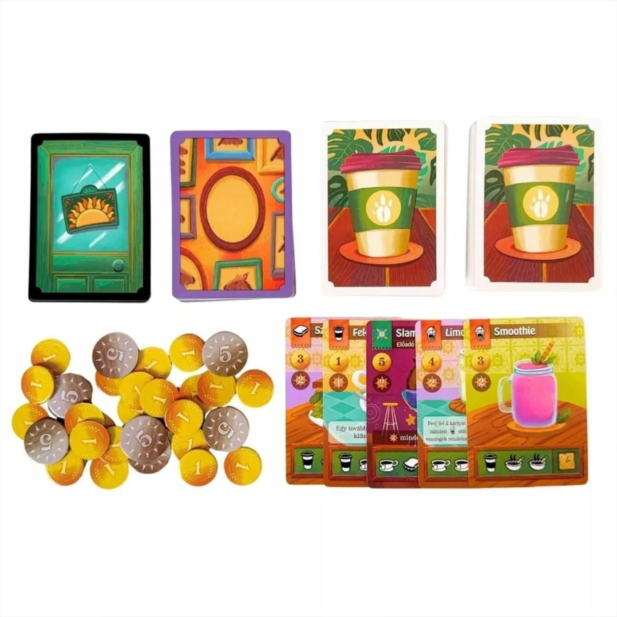 Keverjétek meg a kávézókártyákat, és képezzetek belőlük egy képpel lefelé fordított paklit a játéktér közepén - ebből fedjetek fel 4 kártyát képpel felfelé. Ez lesz a kínálat. A különleges vendég kártyákat keverjétek meg és fedjetek fel 5 kártyát képpel felfelé.