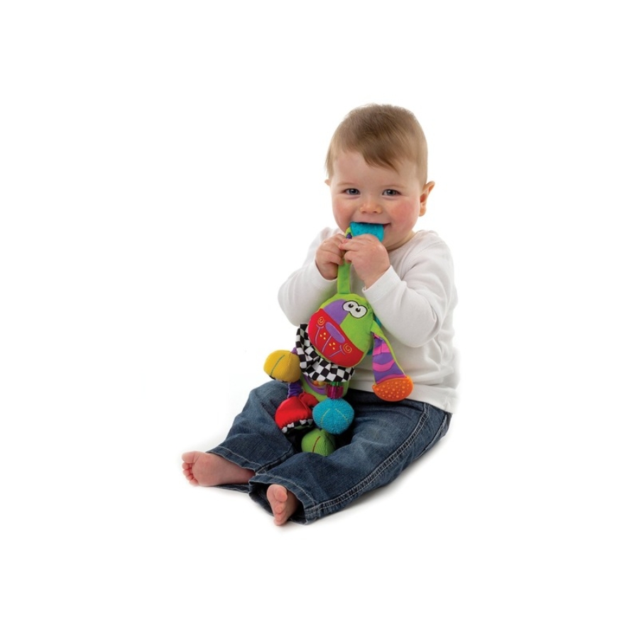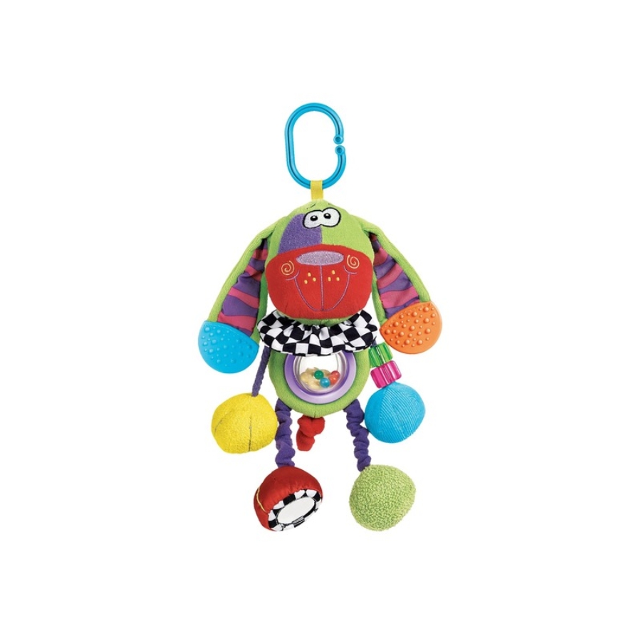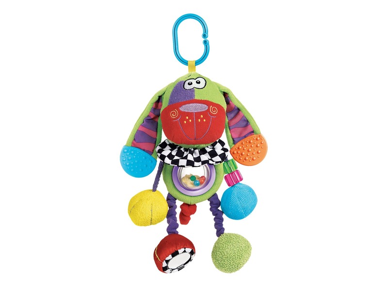 Kutyás rágóka bébijátékFelakasztható kiskutya, csörgő-zörgő hangokkal! A Kutyás rágóka bébijáték plüssből készült zöld kutyus, rengeteg meglepetéssel, amik lekötik a pici figyelmét. A kutyus egyik lába sípoló hangot ad ki magából, míg egy másik egy tükörben ismerkedhet meg a gyerek saját képével. A kutyus fülei rágókaként használhatók, a különböző tapintású textilek fejlesztik a tapintást és az érzékszerveket. A Kutyás rágóka bébijáték babakocsira, kiságyra is felakasztható.
