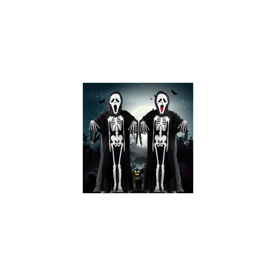 Ha igazán rémisztő megjelenést szeretnél a következő Halloween bulin vagy jelmezversenyen, akkor ez a csontvázas sikoly jelmez lesz a tökéletes választás! A jelmez azonnal borzongató hangulatot teremt, ahogy megjelenik a sötétben: a hosszú fekete köpeny a fehér csontvázmintával kifejezetten látványos, a hozzá tartozó ikonikus sikoly maszk pedig gondoskodik arról, hogy mindenki megijedjen tőled egy pillanat alatt. A szett kétféle változatban elérhető, így választhatsz a klasszikus fehér maszk vagy a vérvörös szájat ábrázoló változat között, attól függően, mennyire szeretnél félelmetes hatást kelteni.