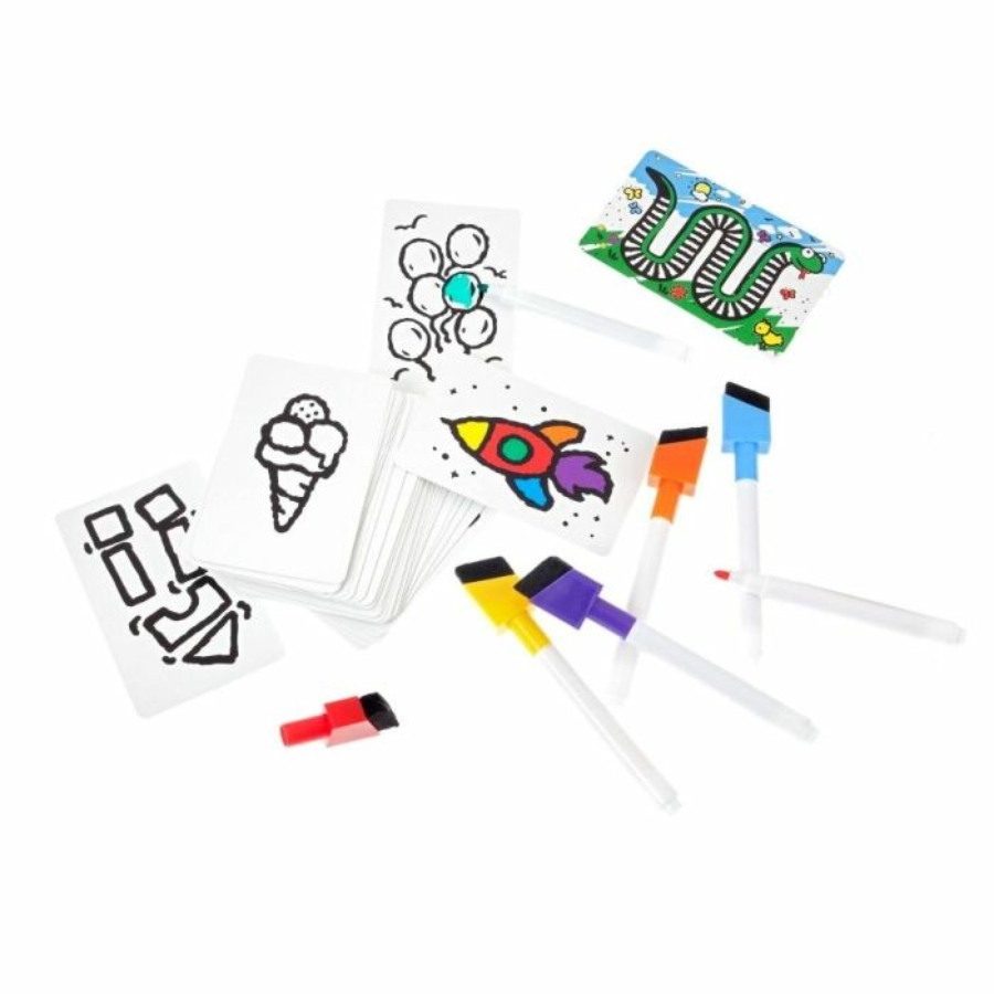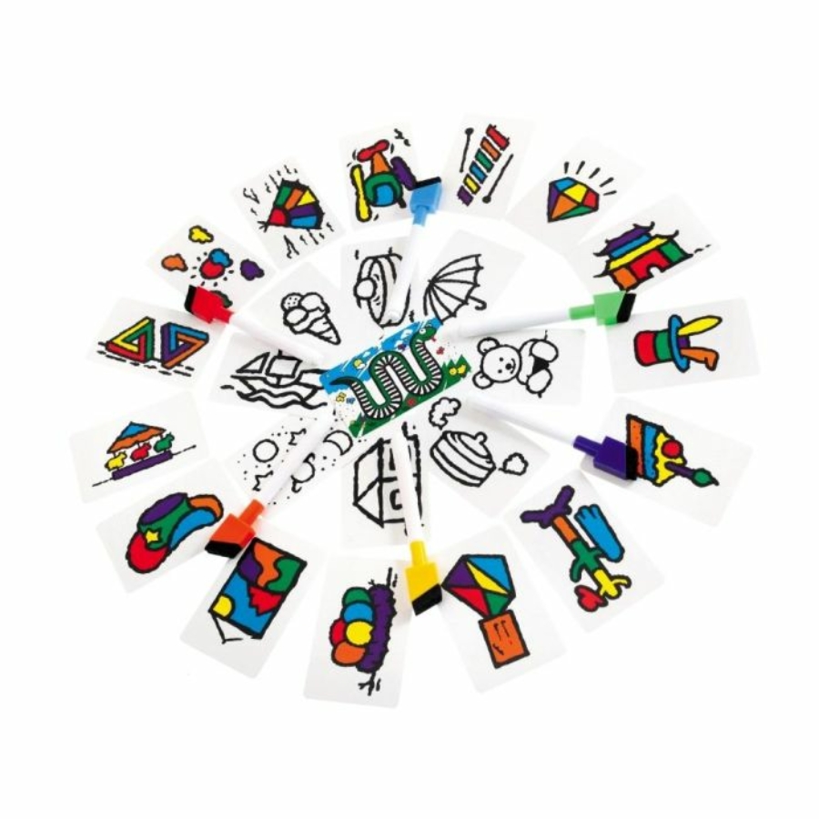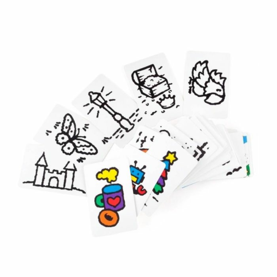 A doboz tartalma 55 db színezhető kártya, 5 db pontozókártya, 6 db filc törlőszivaccsal és a játékszabályzat.