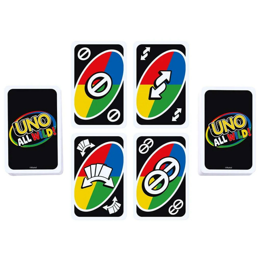Az UNO: All Wild! kártyajáték különlegessége a speciális akciókártyákban rejlik, amelyek még váratlanabbá és izgalmasabbá teszik a játékot. A "Wild Reverse" és "Wild Skip" kártyák megfordítják a játék menetét vagy kihagynak több játékost is, míg a "Wild Draw 2" és "Wild Draw 4" lapok még több lapot kényszerítenek az ellenfelek kezébe. Az igazi csavarokat azonban a "Wild Forced Swap" és "Wild Targeted Draw 2" kártyák adják, amelyekkel akár teljes paklikat cserélhetsz el, vagy célzottan megnehezítheted egy adott játékos helyzetét.
